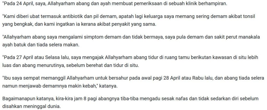 Dilaporkan juga hanya beberapa hari sahaja jarak masa, bermula dari imam tersebut positif diagnosis, melarat kesihatan dan akhirnya meninggal dunia.